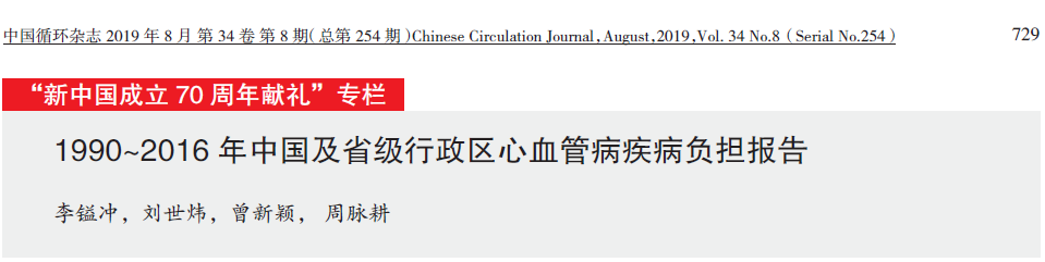中国疾病预防控制中心慢性非传染性疾病预防控制中心周脉耕等《中国循环杂志》发表了近三十年来中国心血管疾病负担报告。